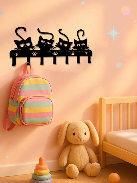 Whimsical 3-Cat Silhouette Wall Rack with 5 Hooks – Black Metal Key Holder & Entryway Organizer (9.45 in.)